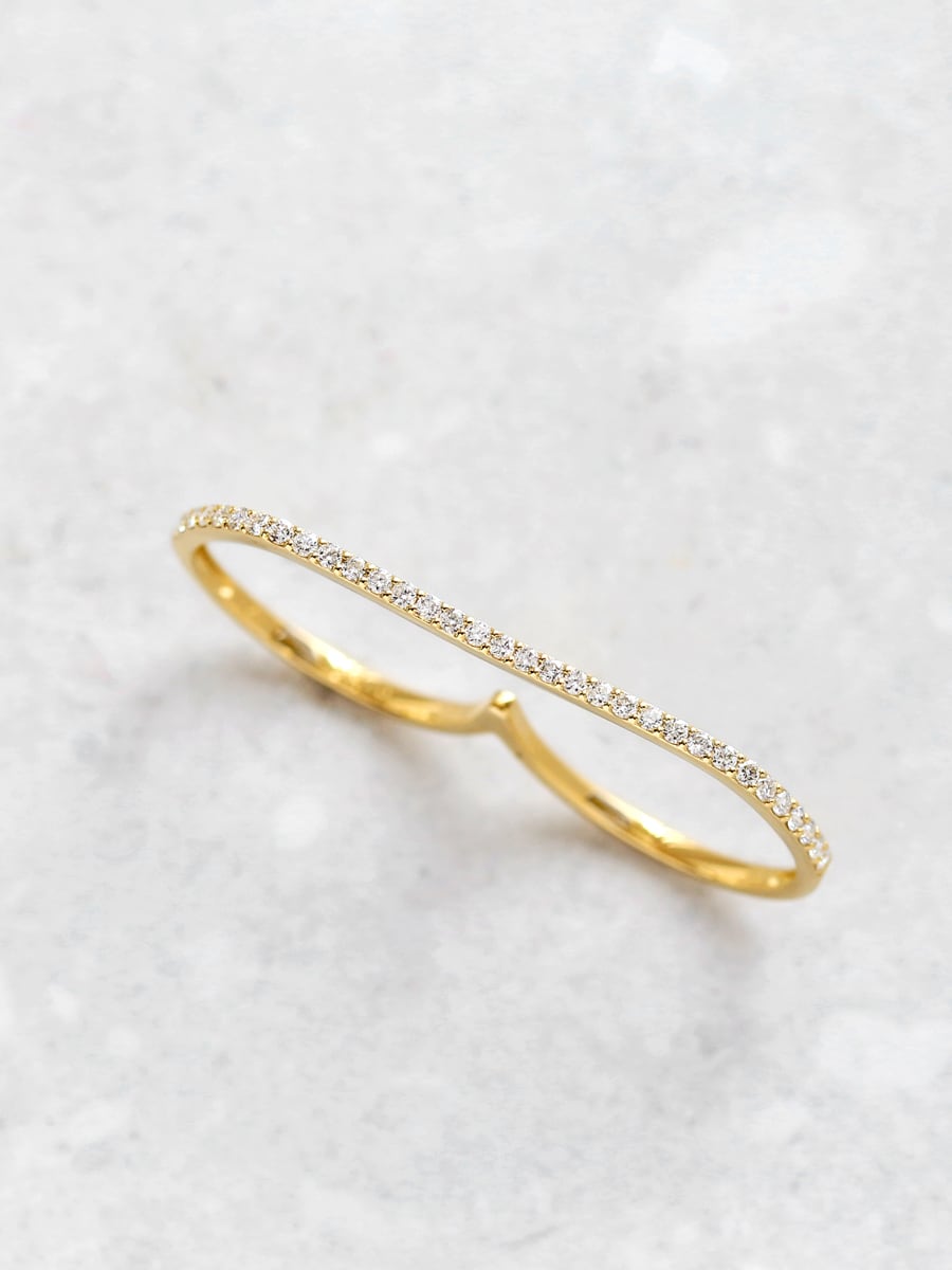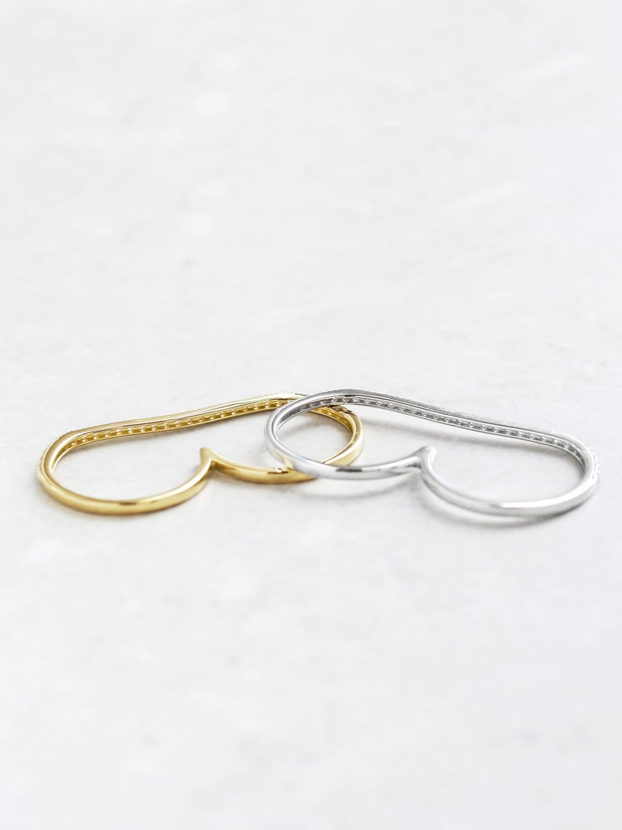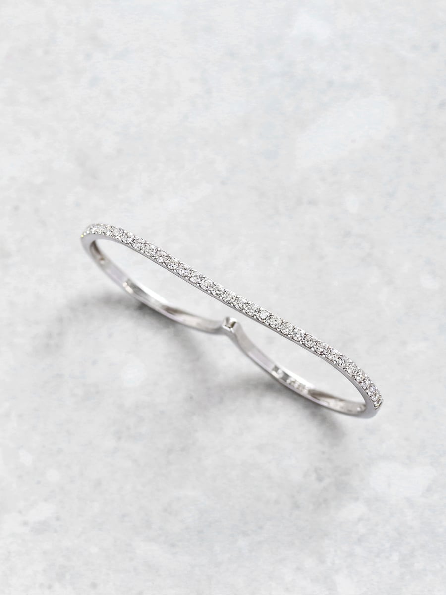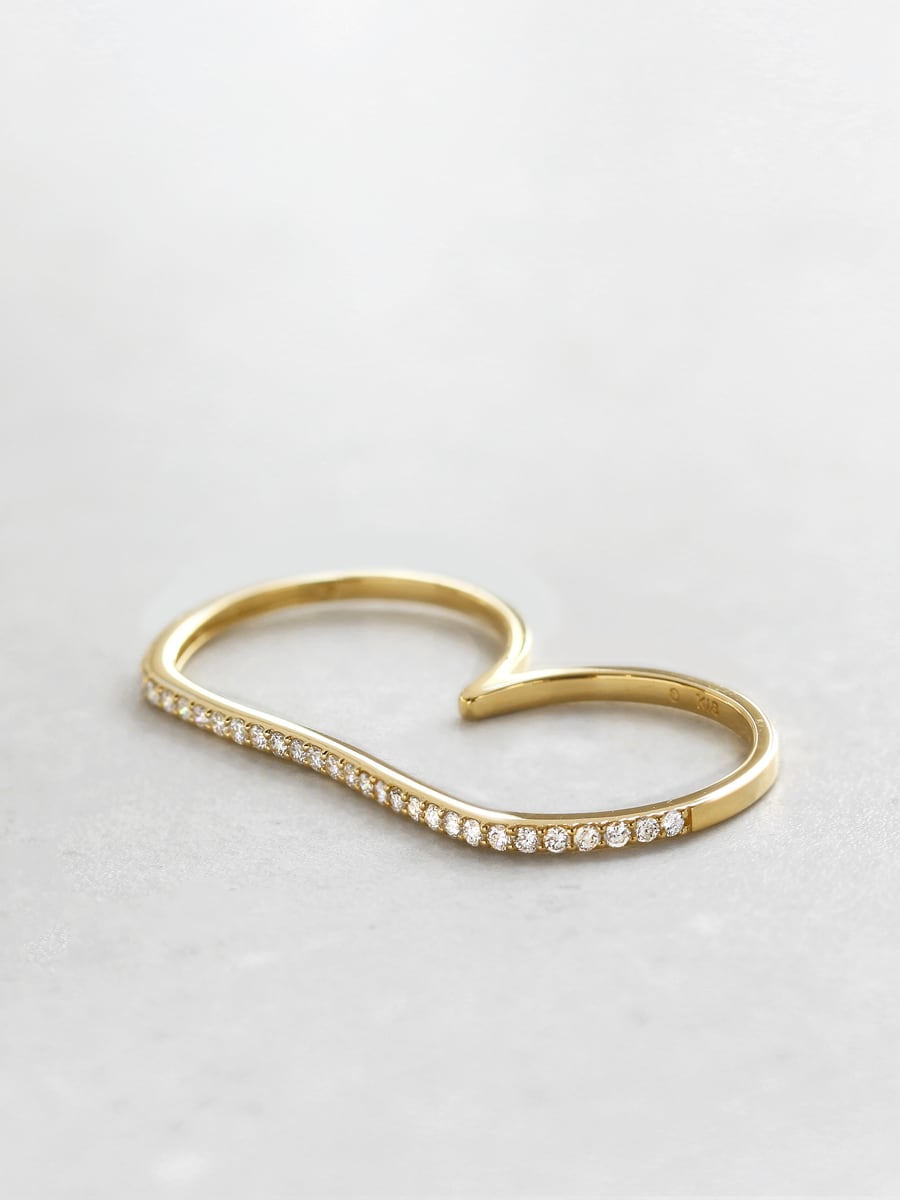 隣り合った2本の指にはめる個性的なデザインに、華奢なラインに一粒一粒澄んだ輝きのメレダイヤモンドを行儀よくセットし、特別なクチュール感のある仕上がり。