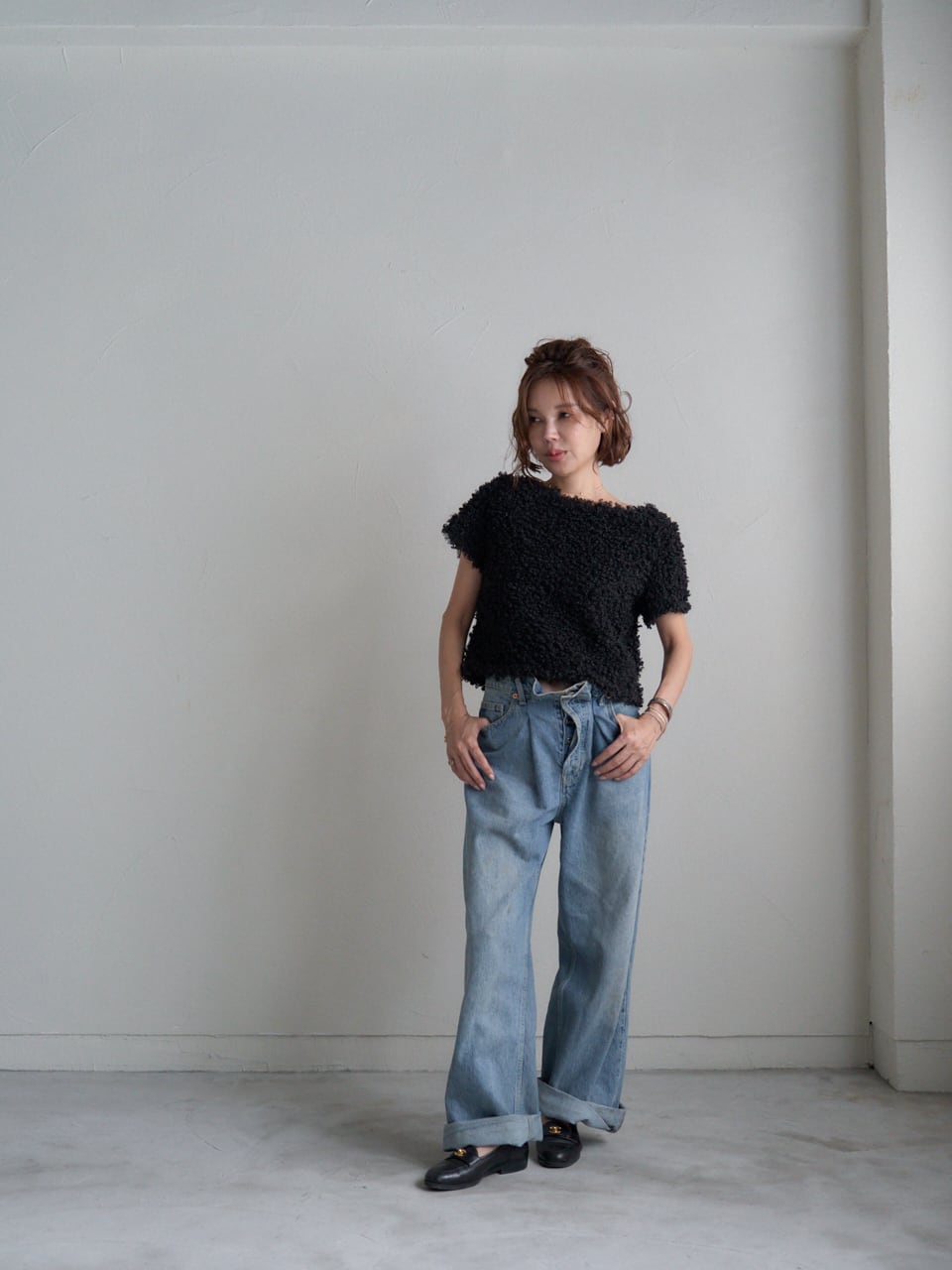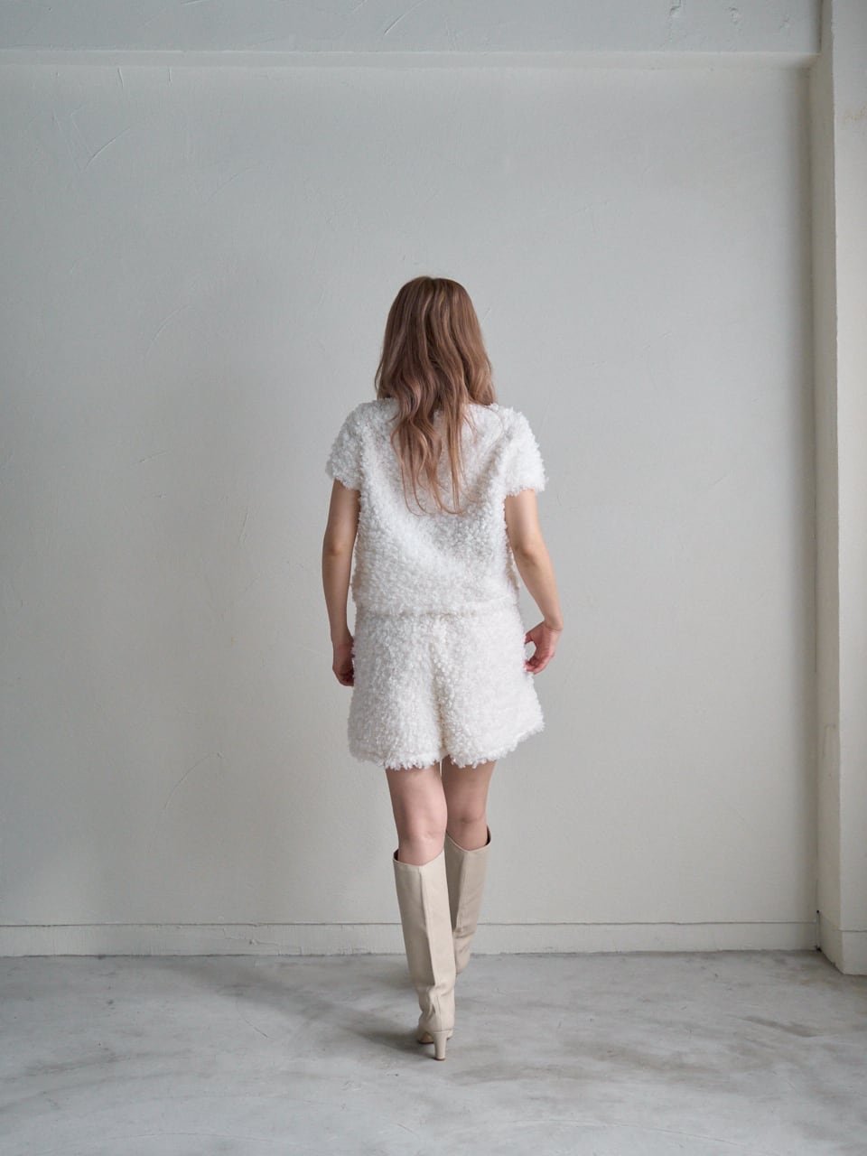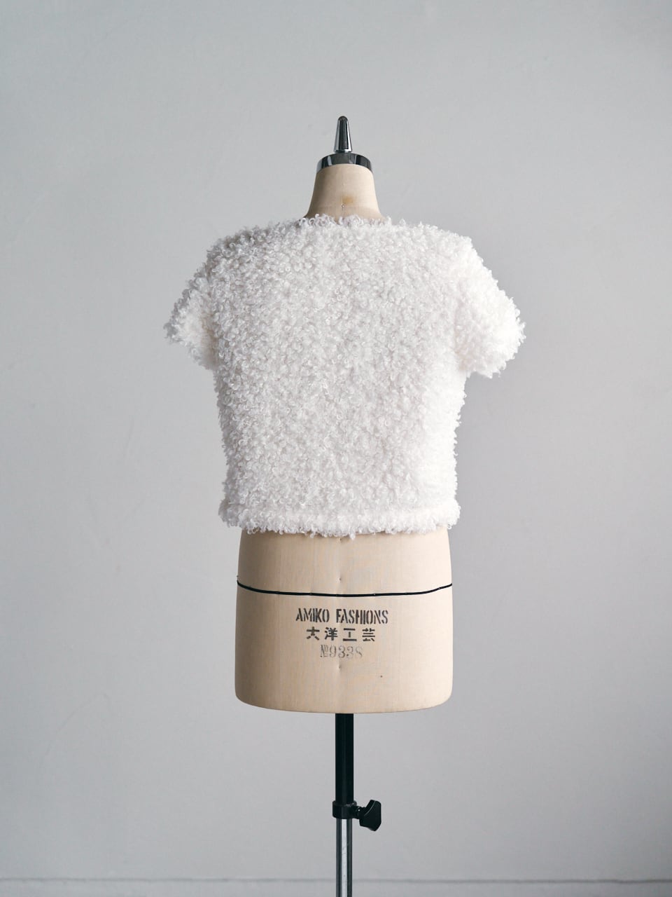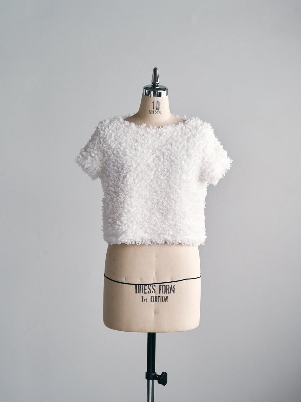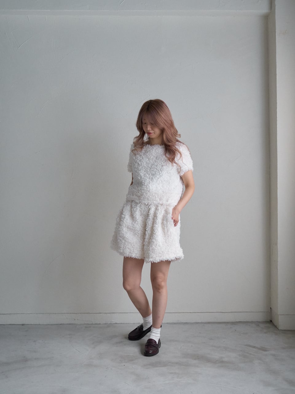 肌触りの良いフェイクファー素材を使用し、コンパクトなサイズ感でどんなボトムにもバランスの取りやすいように仕立てています。