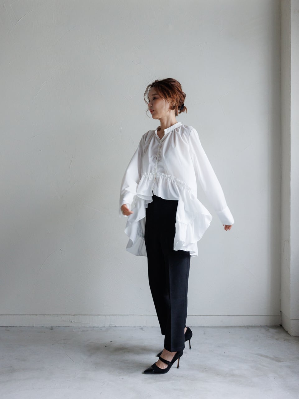 裾の立体的なフリル動きがあるシンプルなシャツに女性らしいニュアンスをプラス。1枚で着映えする主役アイテム。ショート丈はバランス良くスタイルアップが狙えます。