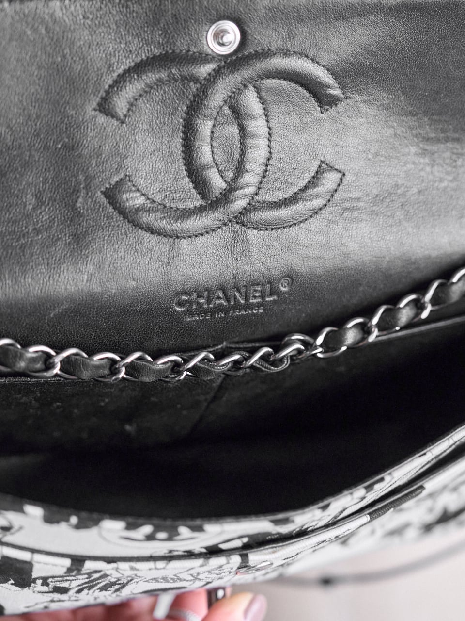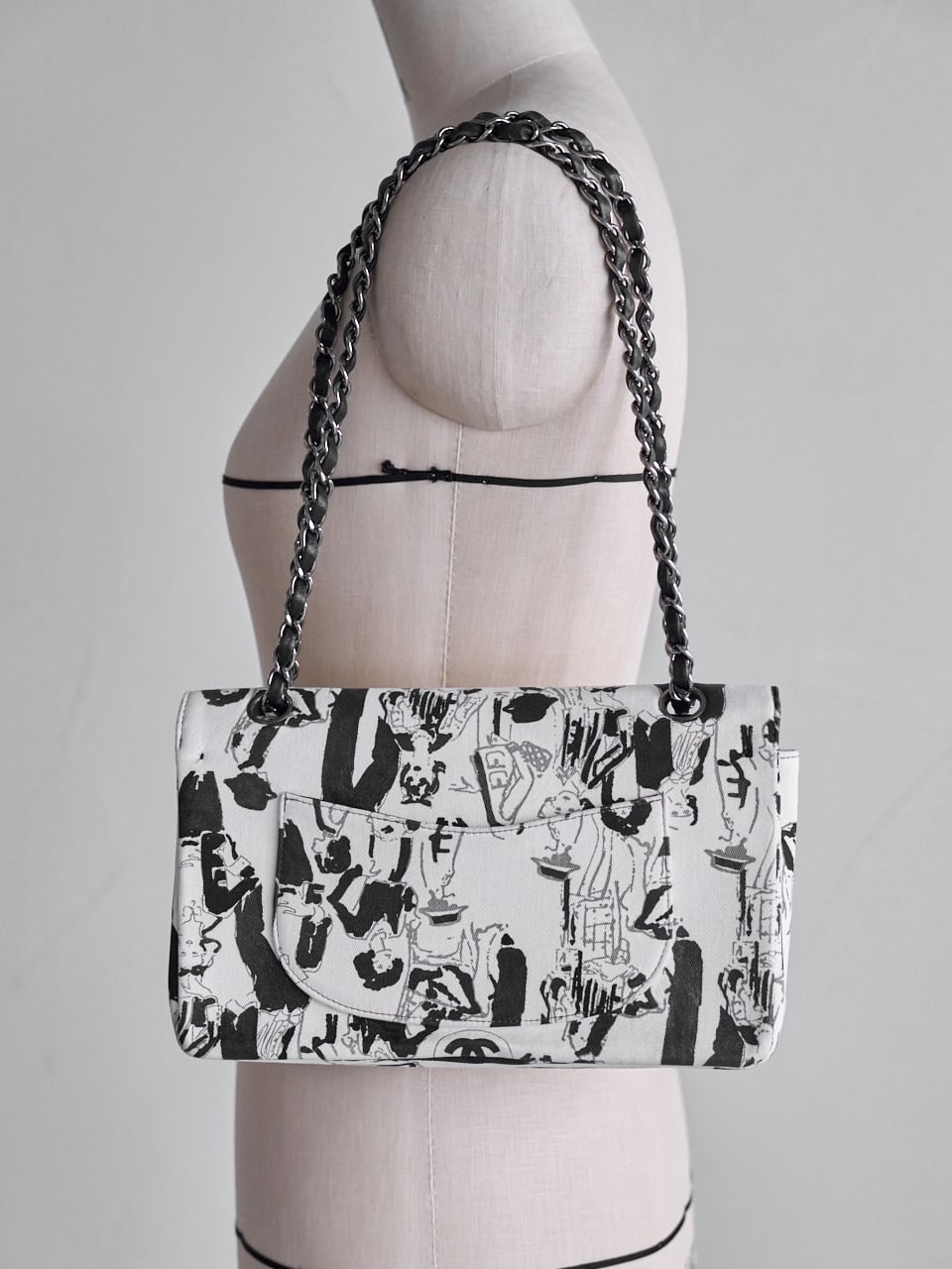 ブラック×ホワイトのコントラストに、人物モチーフのグラフィカルなプリントが大胆にあしらわれたデザインは、モード界を牽引したカール・ラガー・フェルドのエッセンスを感じさせる特別な一品です。