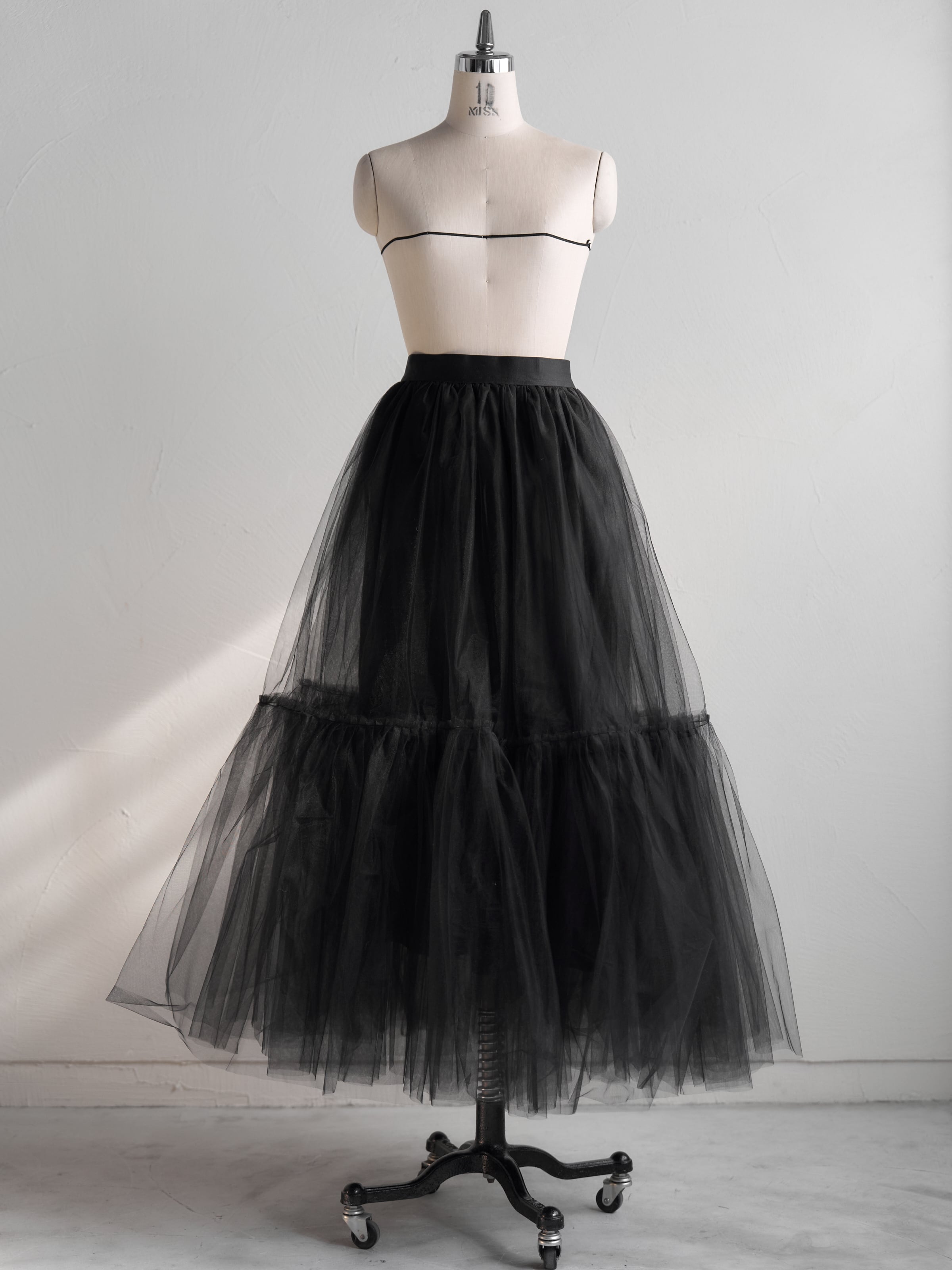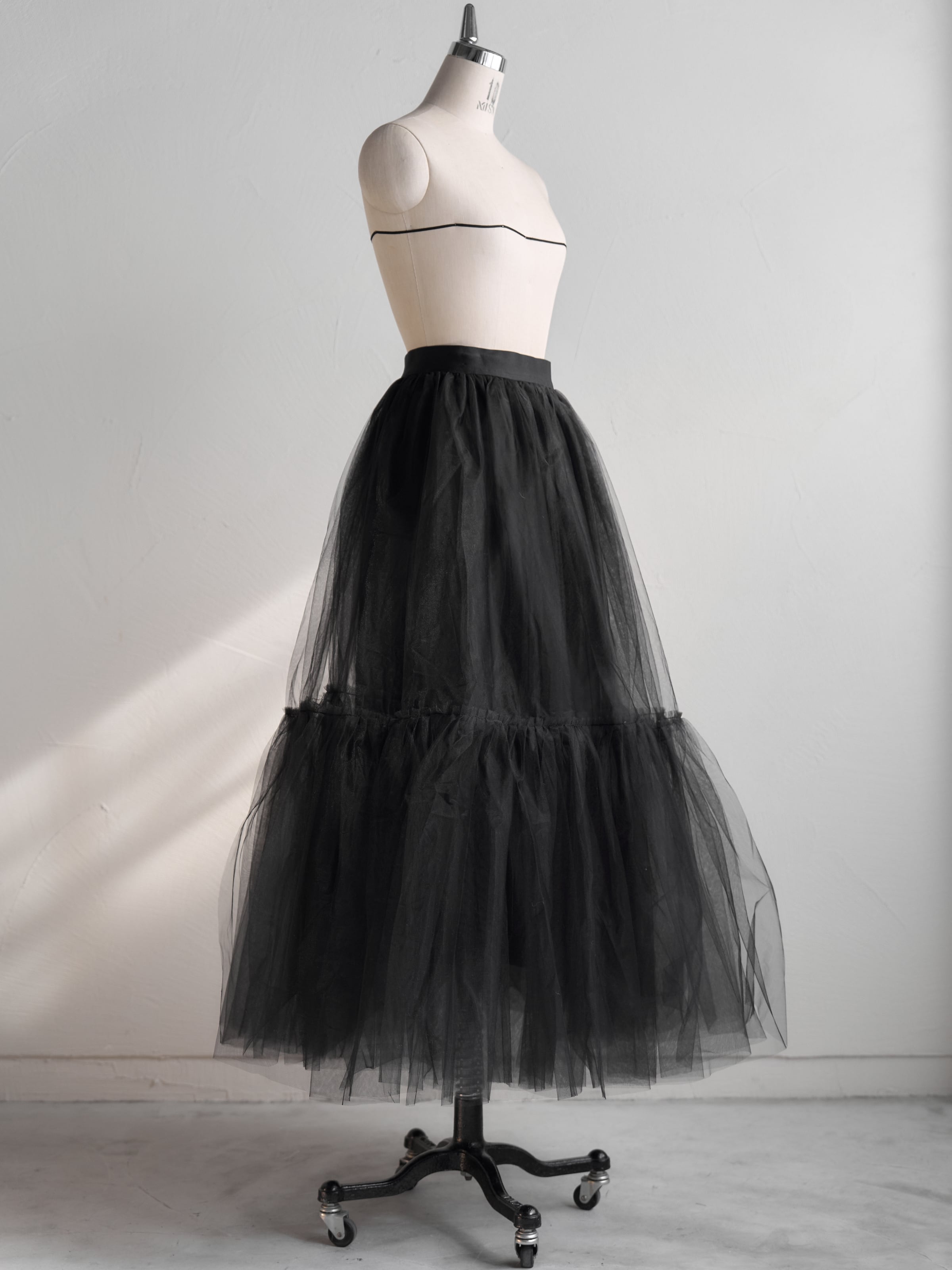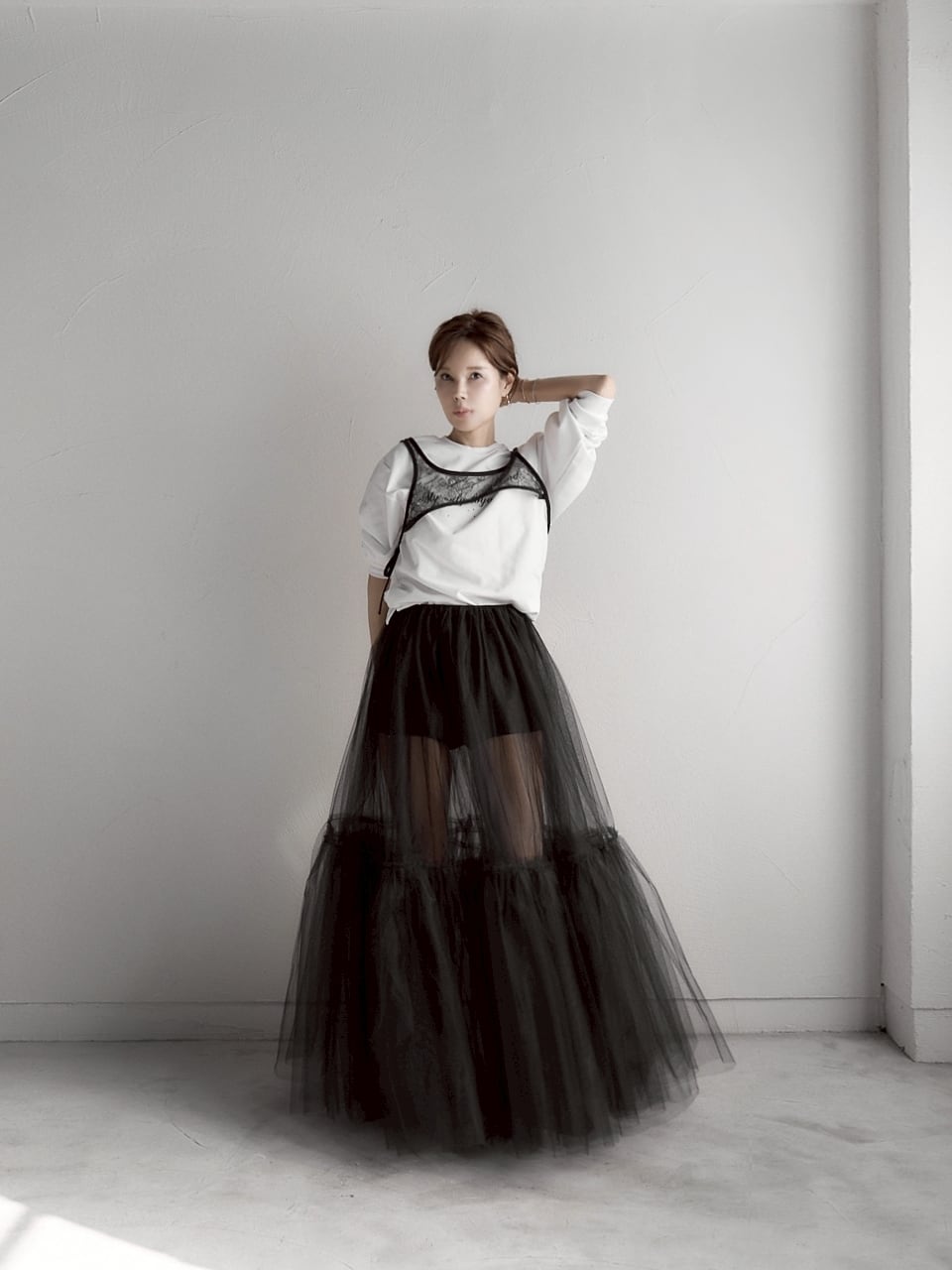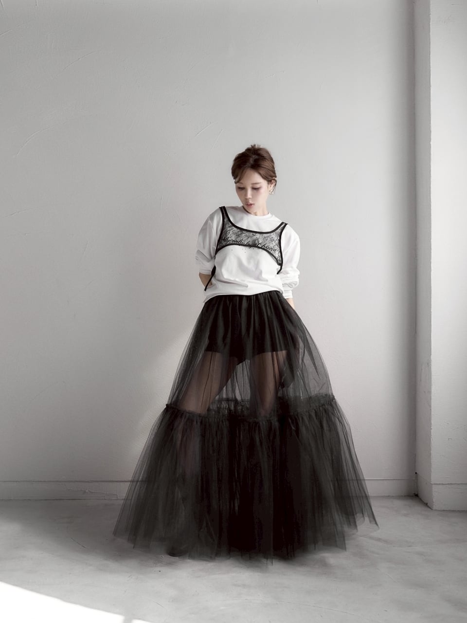 たっぷりと重ねたチュールが動くたびに軽やかに揺れ、コーデにドラマティックな印象をプラスします。透け感レイヤードで抜け感のあるスタイルにも。