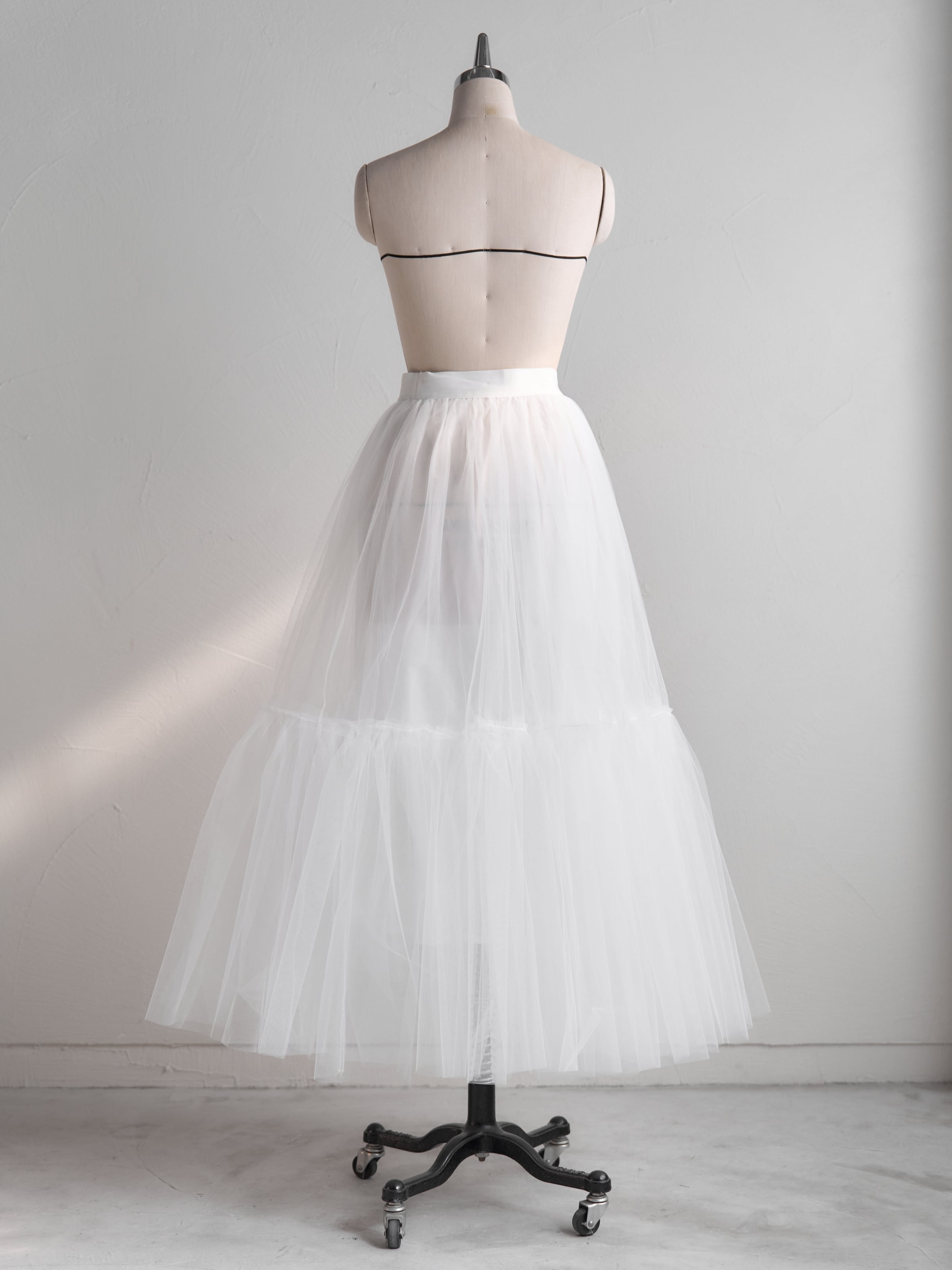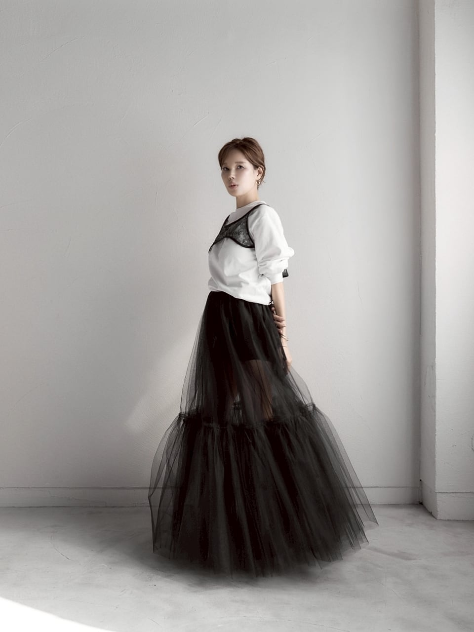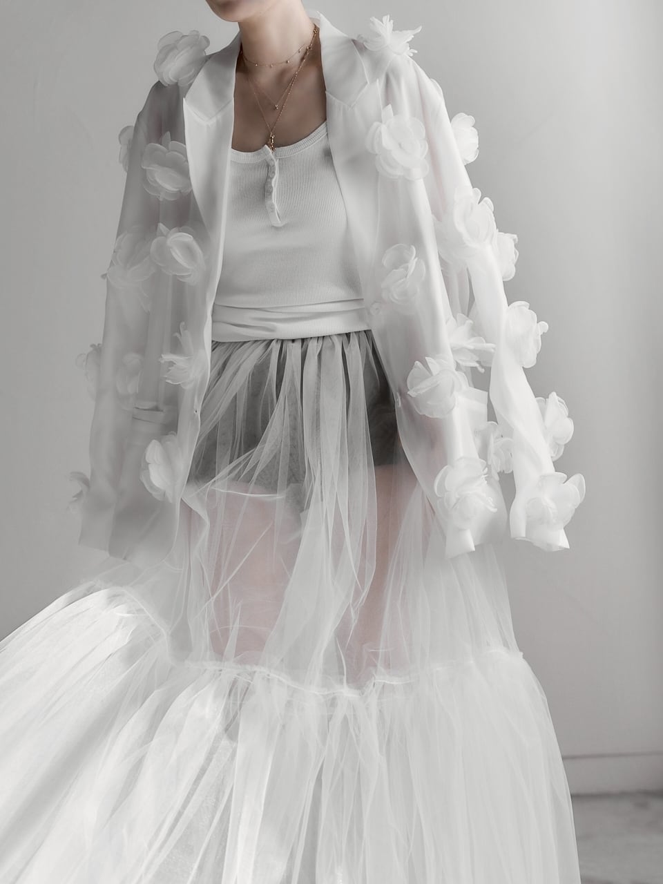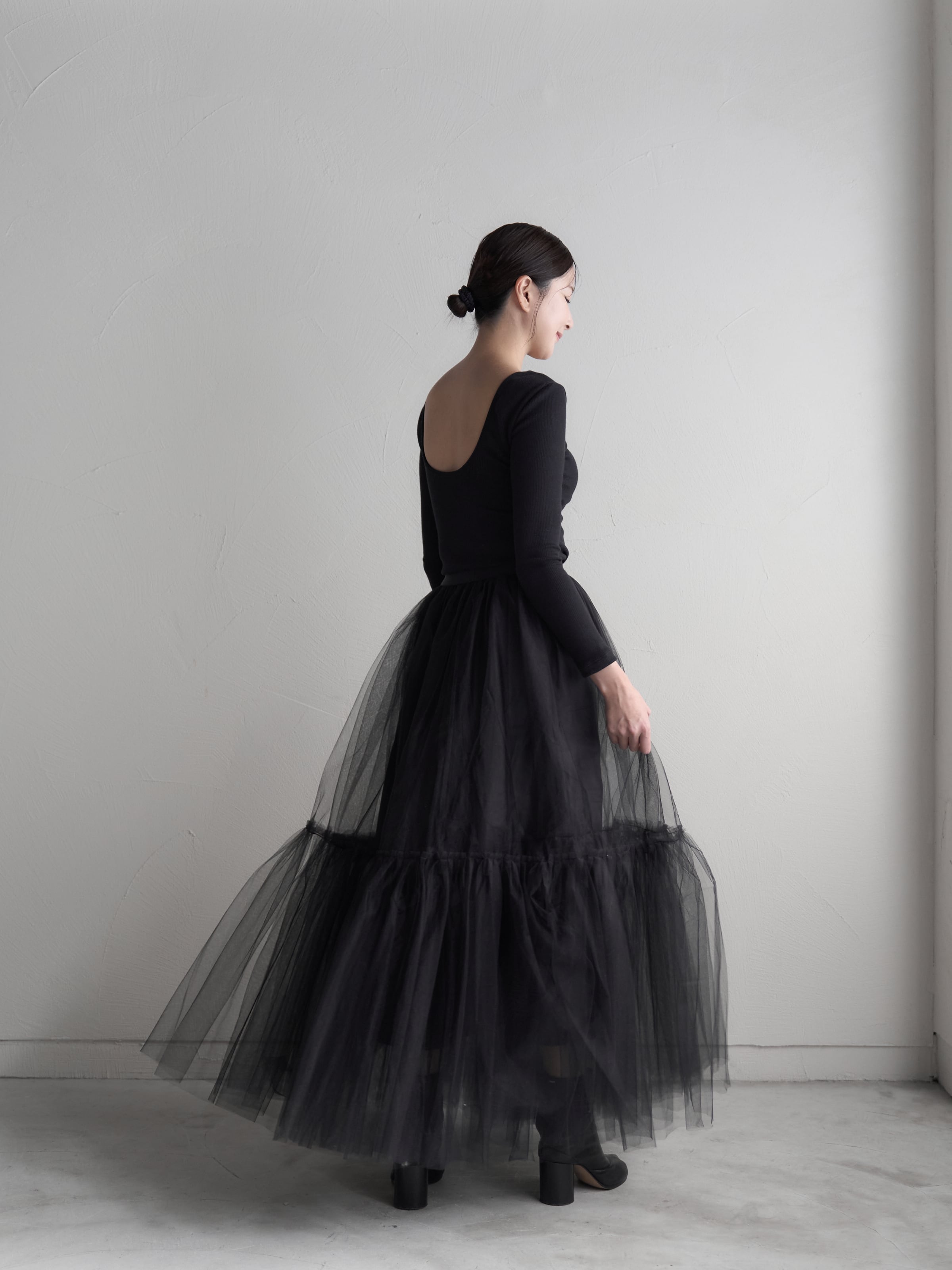 たっぷりと重ねたチュールが動くたびに軽やかに揺れ、コーデにドラマティックな印象をプラスします。透け感レイヤードで抜け感のあるスタイルにも。