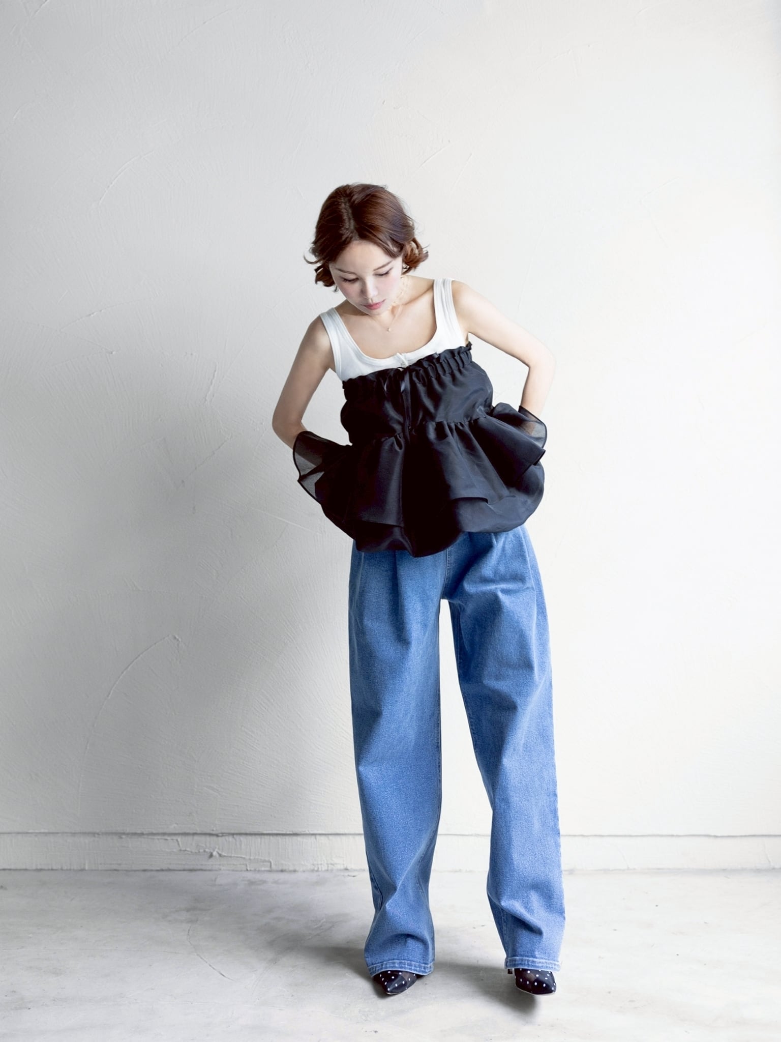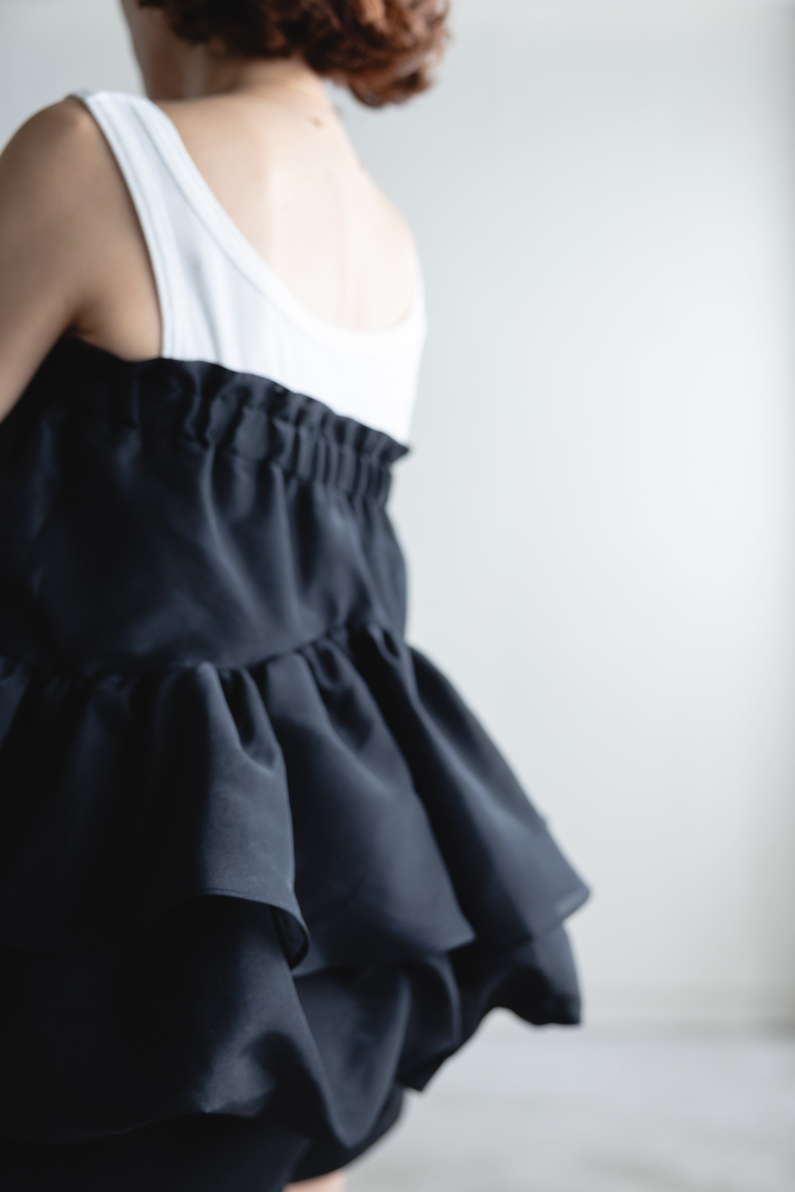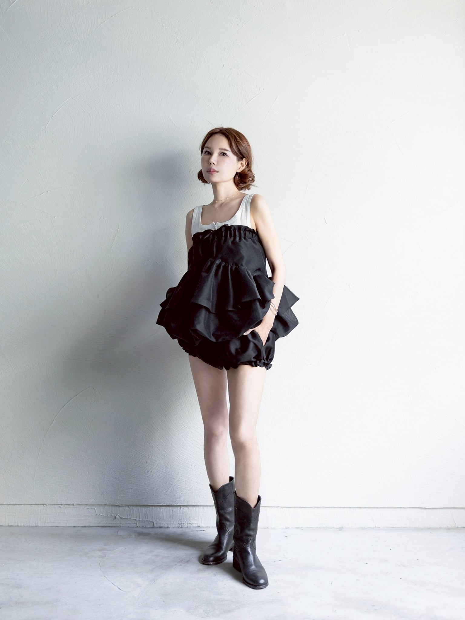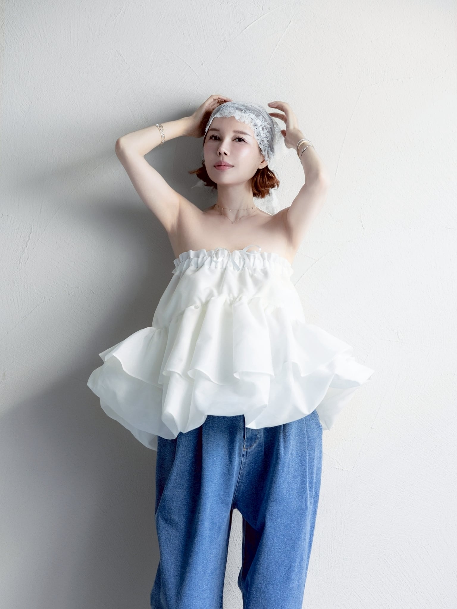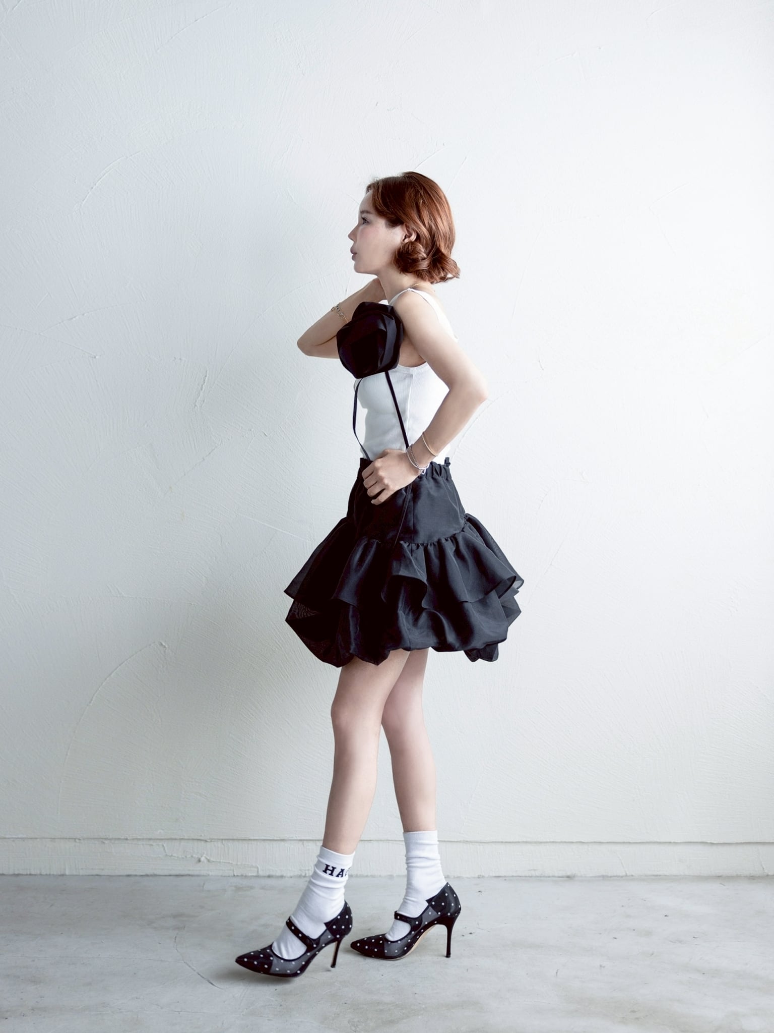 重なり合うフリルデザインが動くたびに表情が変わり、フェミニンで印象的なスタイリングに。