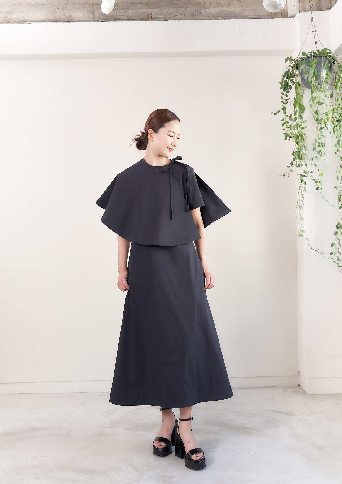 シンプルで飽きのこない半袖のAラインワンピースと別パーツの大きなケープのセットです。